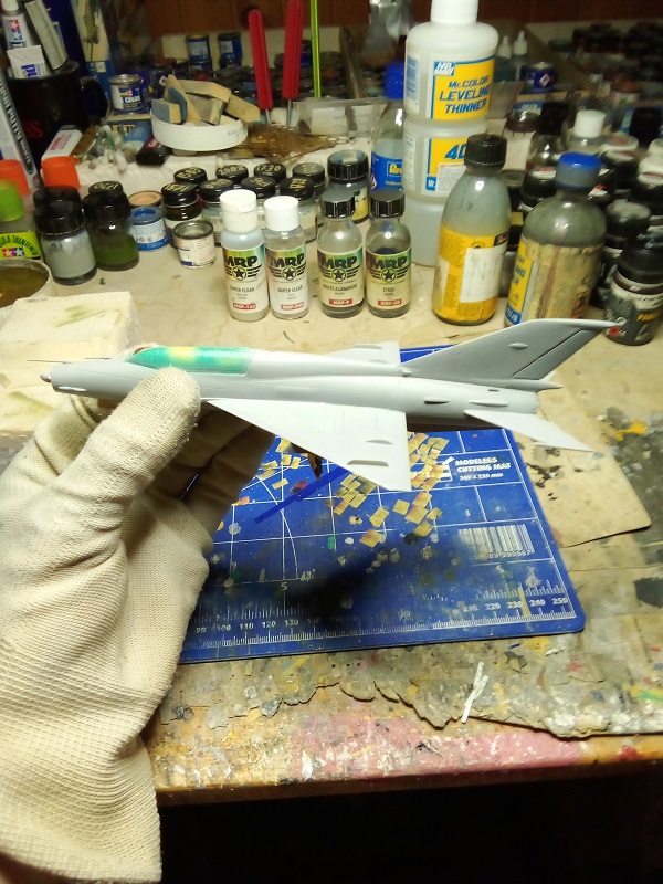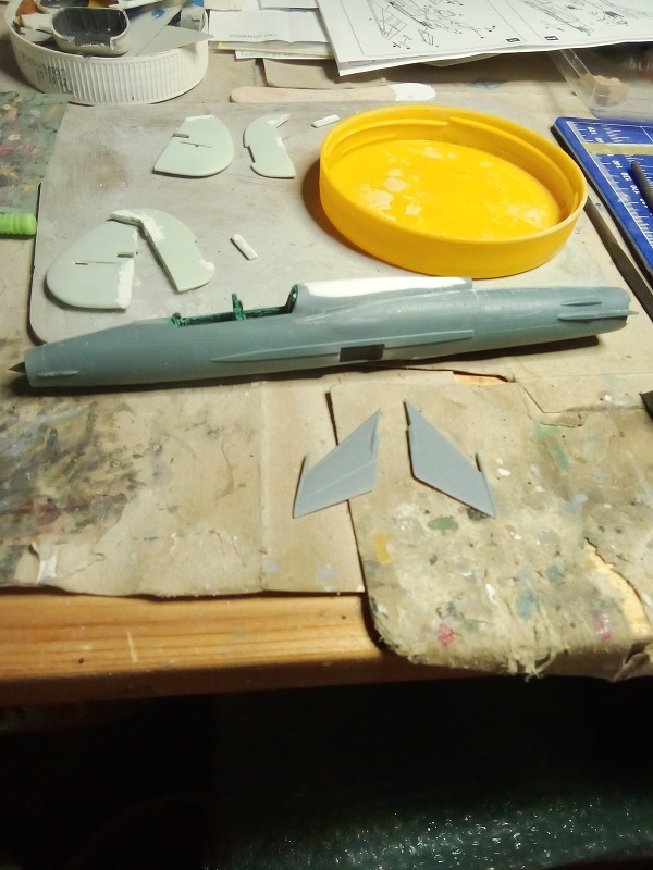 Sledilo je maskiranje zasteklitve in pritrditev smernega stabilizatorja, ki sem ga pred začetkom gradnje odrezal stran, ker je bil krivo odlit.