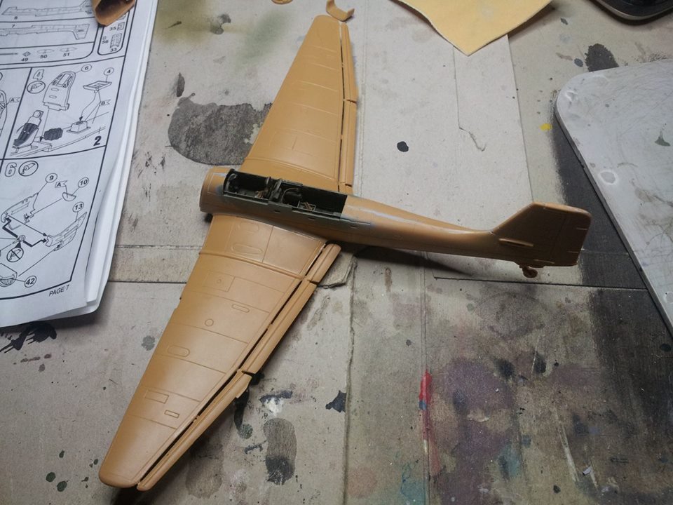 Nato sem zlepil krila, jih pritrdil na trup, pokital spoje med krili in trupom z uporabo belega lepila, ter zlepil še nos letala, ki pa ga je bilo potrebno močno pokitati in posledično zbrusiti. Za kitanje nosu letala sem se poslužil kar temeljne barve, ki sem jo v več močnejših slojih z čopičem nanesel na potrebna mesta in po sušenju samo višek odstranil z vatirano palčko namočeno v razredčilu za temeljno barvo.