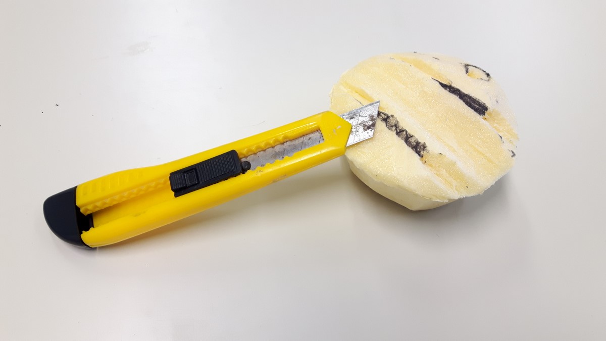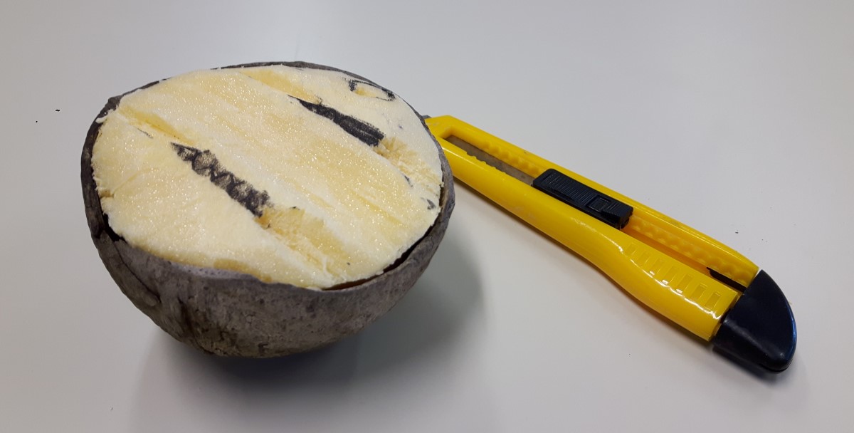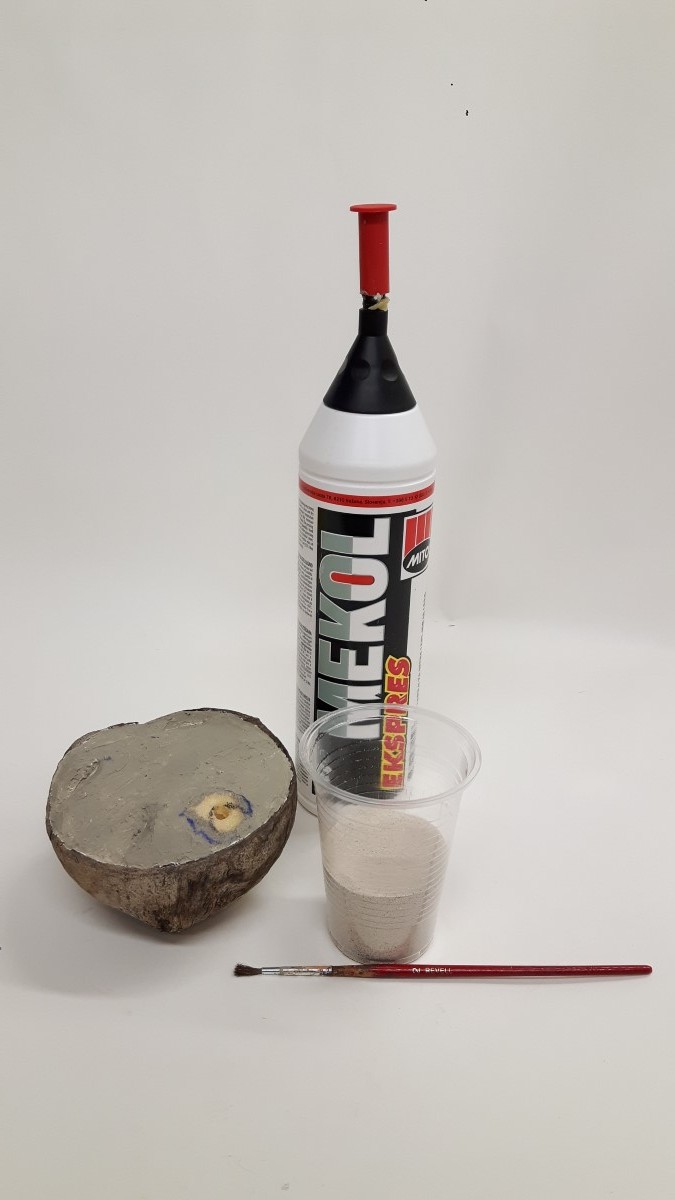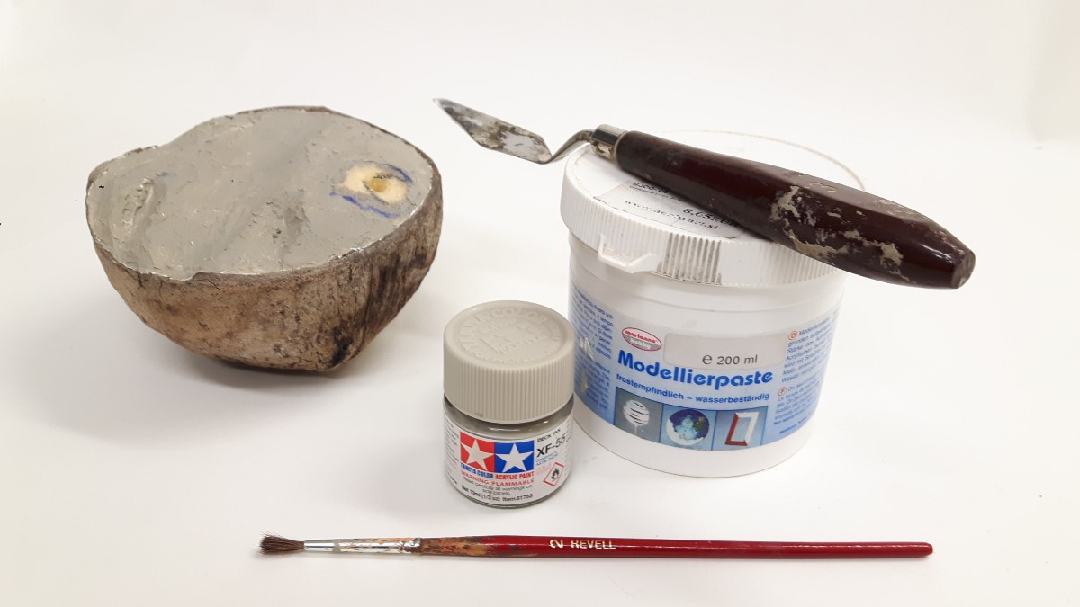 Kot sem že napisal v uvodu sem za osnovo makete vzel polovico kokosa. Najprej sem v kokos zalepil utež in izdelal iz stirodurja polnilo.