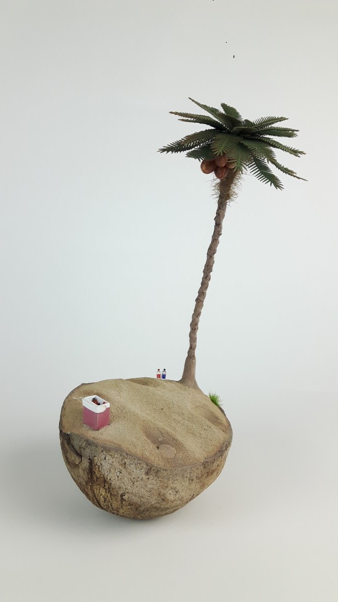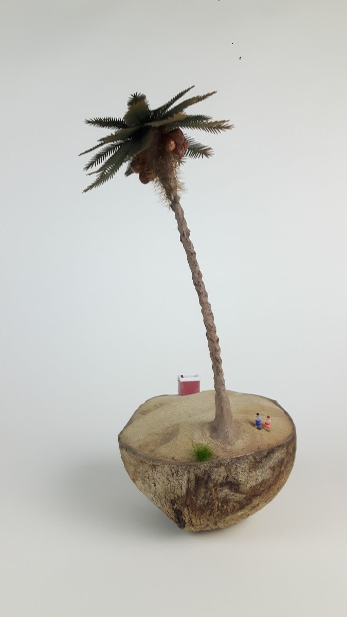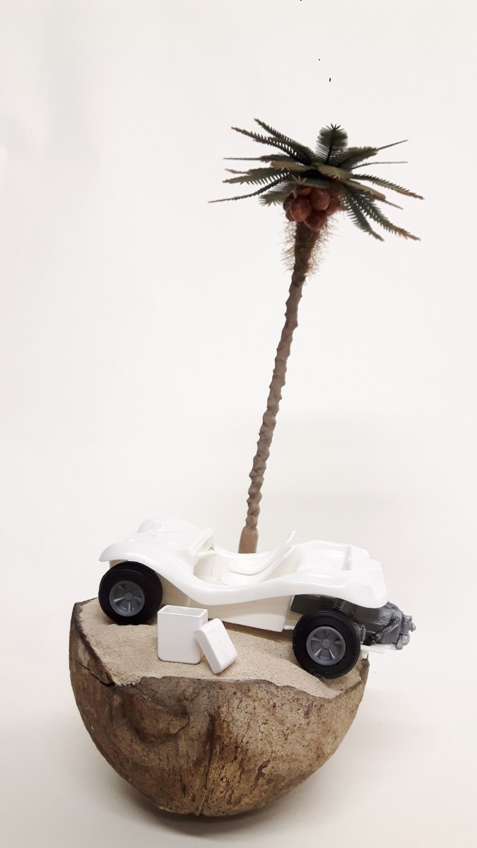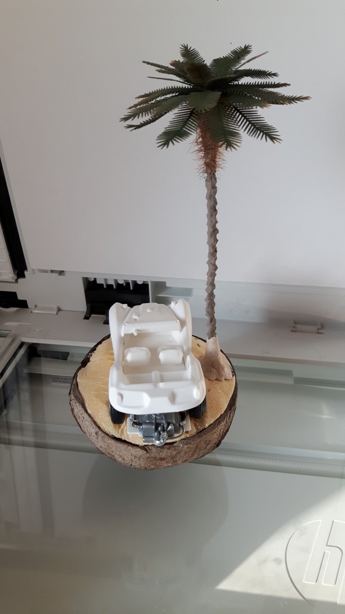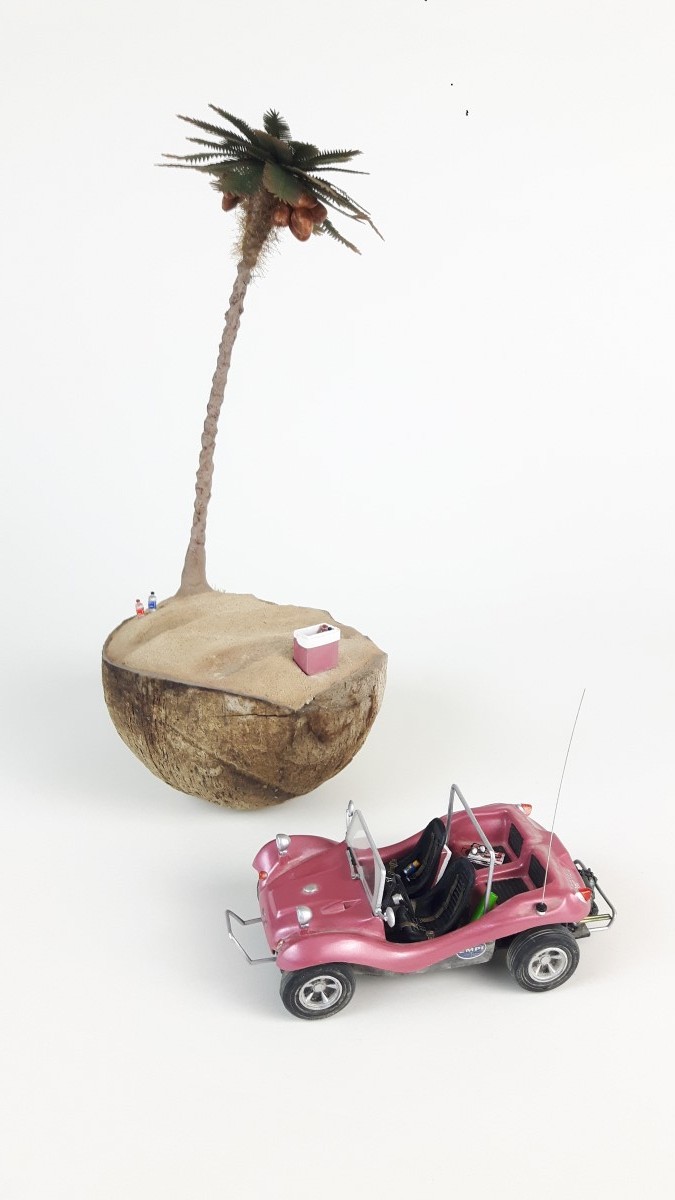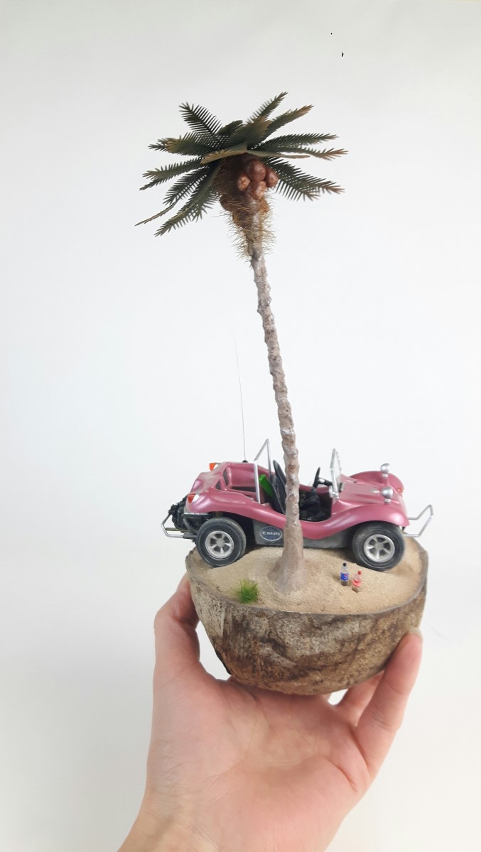 Ideja za izgradnjo makete se mi je porodila, ko sem hotel zavreči kokos, ki sem ga našel na zadnjem potovanju po Zanzibarju. Ker pa je površina za maketo majhna, premer meri približno 12 centimetrov sem vzel za maketo vozilo VW Buggy, proizvajalca Revell v merilu 1:32