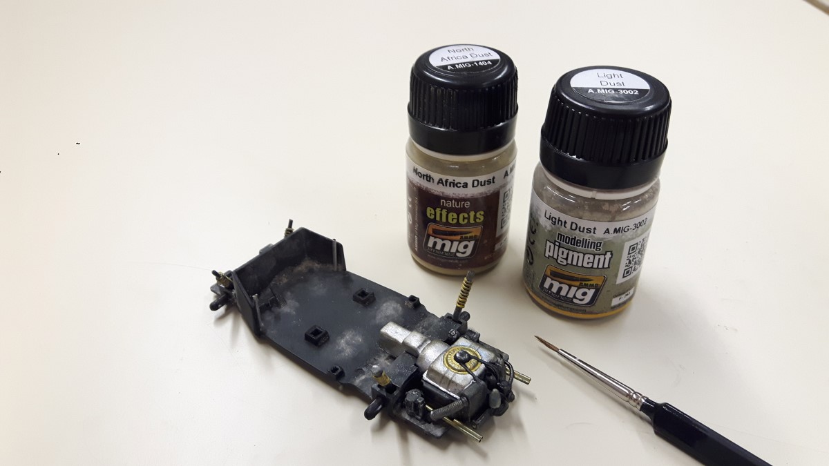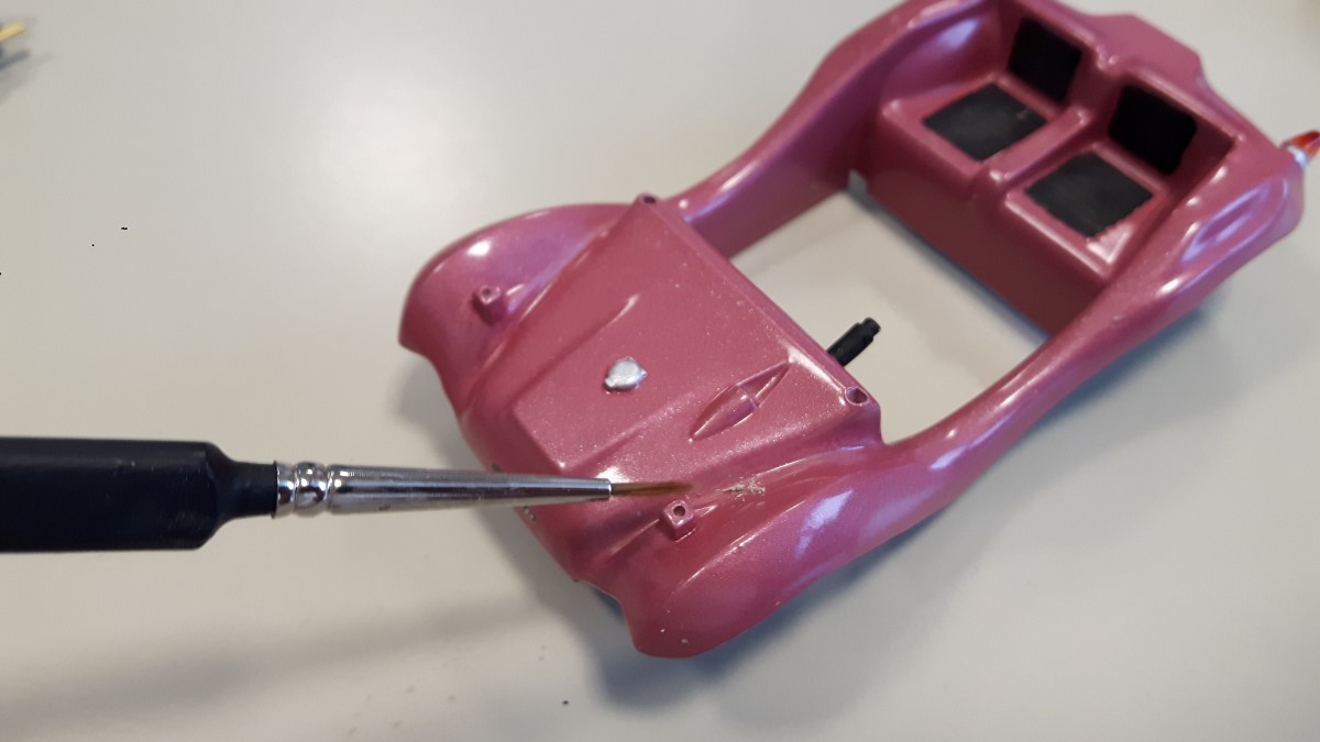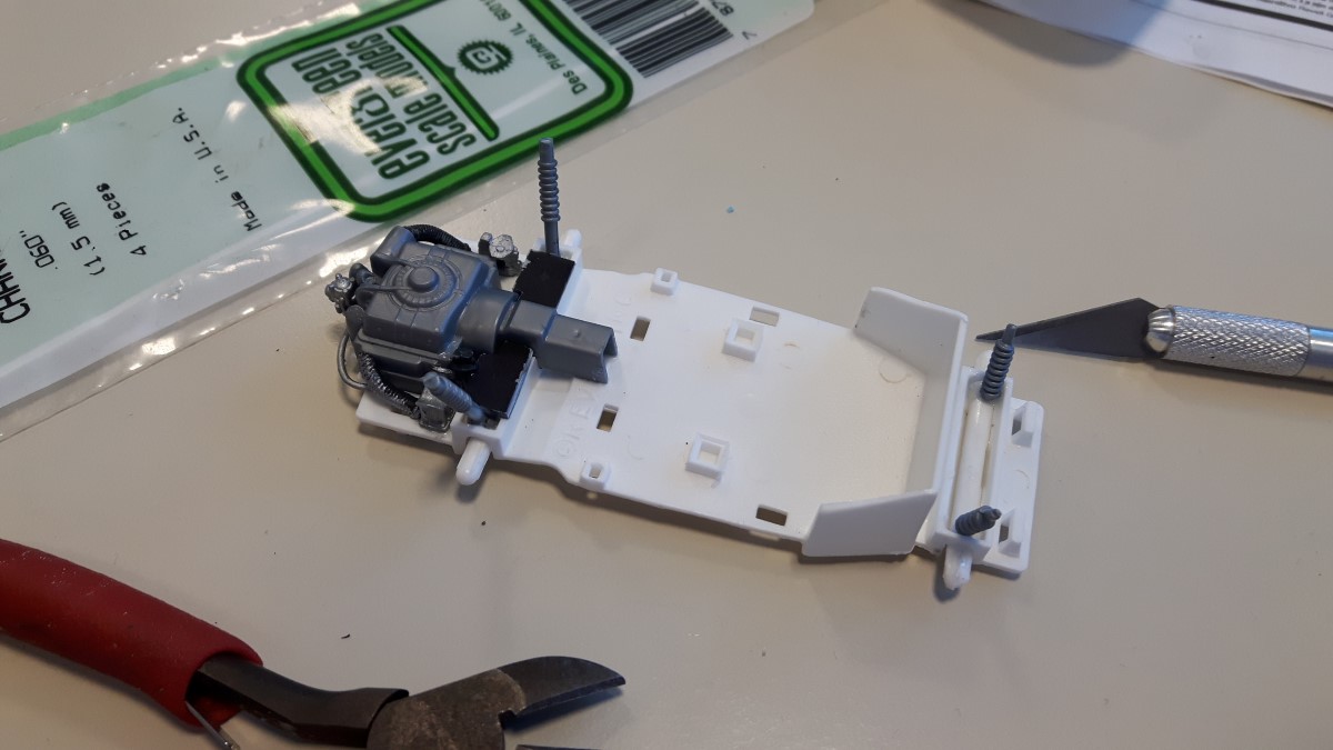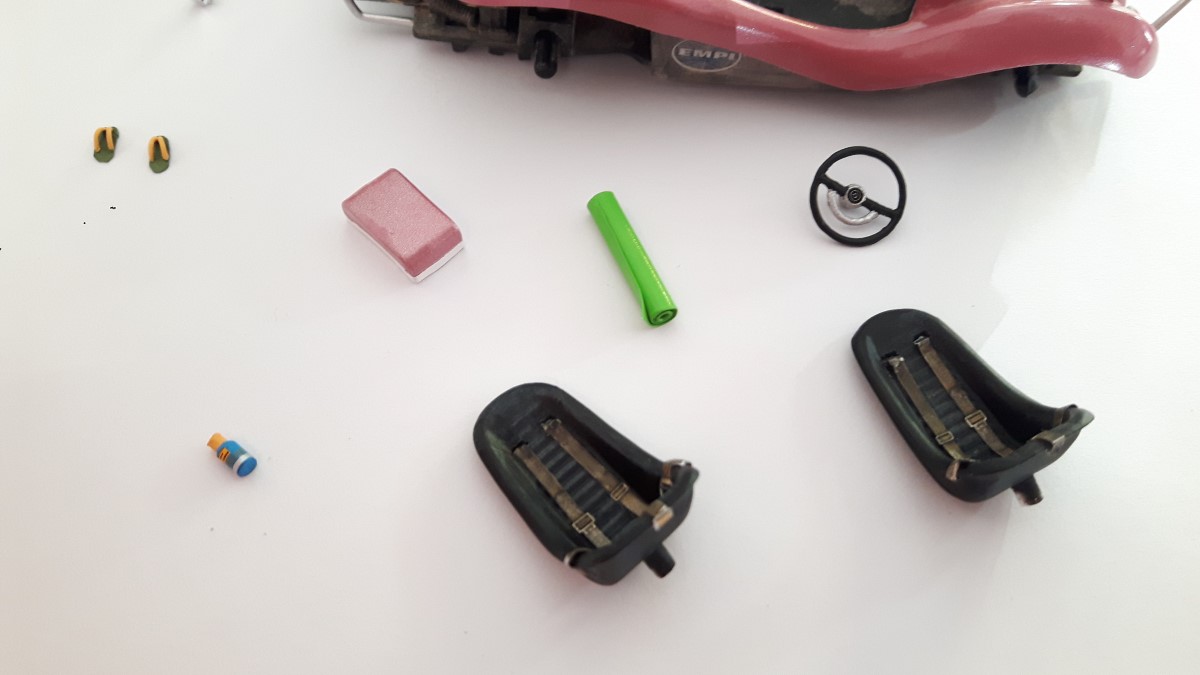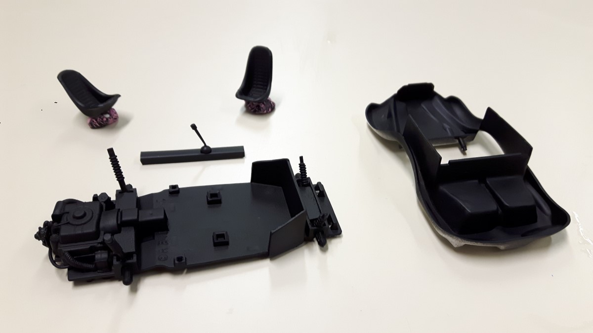 Prav tako se pravi avto razlikuje od maket v notranjosti, zato sem izdelal prestavno ročico, podporne cevi in pedala za gas ter zavoro in vse skupaj prebarval s črno temeljno barvo.