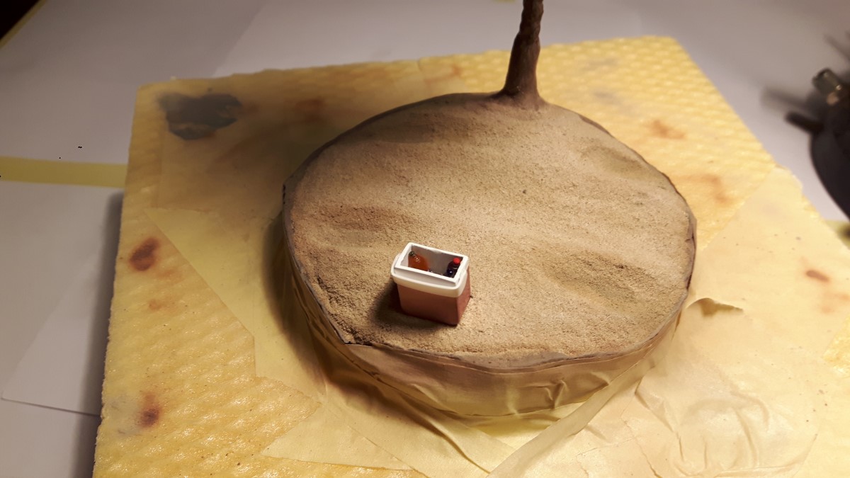 Ta korak je pomemben, ker površina ni ravna in tako hitro vidimo kako se maketa prilega na bodočo podlago. V naslednjem koraku sem stirodur prekril z modelirno maso, kateri sem dodal odtenek barve.