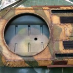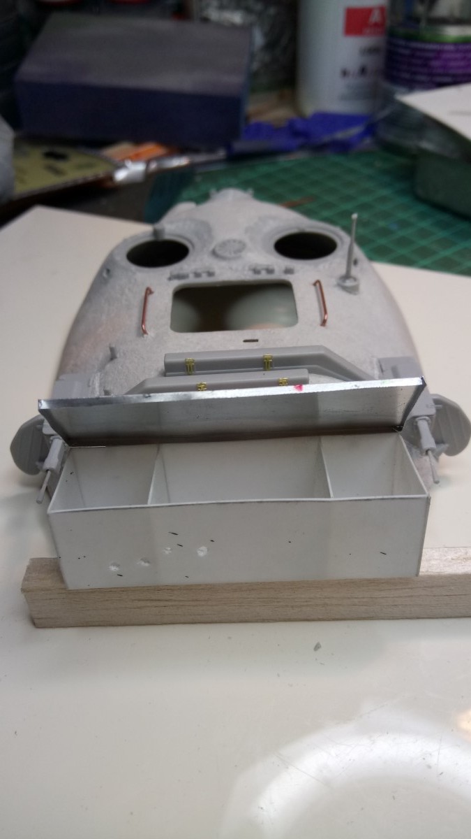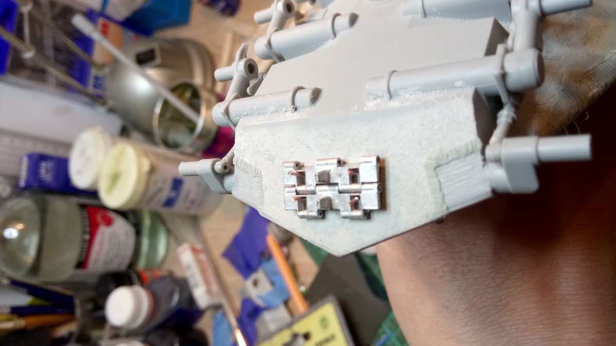 Tank je na sprednjem in zadnjem delu trupa imel rezervne členke gosenic. Ker jih na maketi ni bilo sem nosilce naredil sam tako da sem izvrtal luknje, vstavil bakreno žico, nataknil členke in zaključil z vijaki in podložkami.