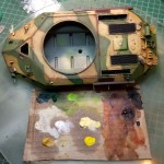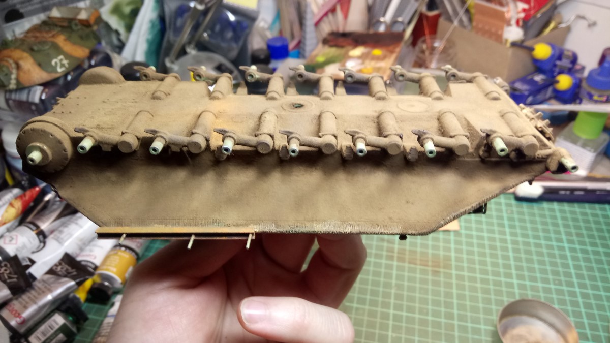 Sledilo je blato na podvozju, kolesih in dnu vozila. Postopek je bil sledeč: najprej sem z mehkim ravnim čopičem po površini namazal zredčeno oljno barvo zemeljskega odtenka, dokler je bila še sveža sem nanjo enakomerno stresel pigment in s čistm mehkim čopičem vse skupaj nežno vtrl tako da sem dobil lepo enakomerno površino. S temnejšim odtenkom oljne barve sem ponazoril sveže mokro blato in umazanijo na zglobih kjer naj bi bila mast.