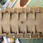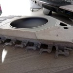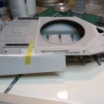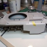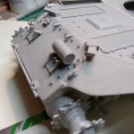Izgradnjo sem pričel z sestavljanjem podvozja in trupa. Napravil sem teksturo litega železa z mešanico Revellovega kita in lepila, nanos je bil s starim čopičem nato je sledilo rahlo brušenje z vodobrusnim papirjem da sem lepo zgladil površino.