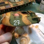 Sledilo je barvanje in staranje.Odločil sem se za dvobarvno kamuflažno shemo (peščena in zelena). Po nanosu barve je sledil nanos laka in začetek staranja. Za staranje sem uporabil tehniko z spužvo tako sem uspel narediti efekt majhnih okruškov barve po celotnem vozilu. Spremembo tonov barve sem dosegel z zelo redčenimi oljnimi barvami katere so bile nanešene v več plasteh.