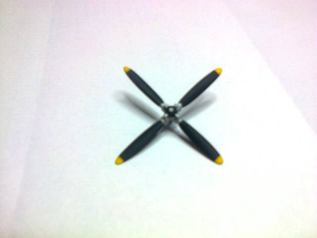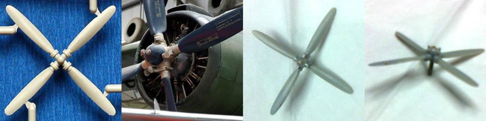 Propeler letala je bilo potrebno kar konkretno dodelati, da je podoben originalu. Od leve proti desni si sledijo slike: propeler v iz škatle, original na letalu in na koncu popravljen in dograjen izdelek.