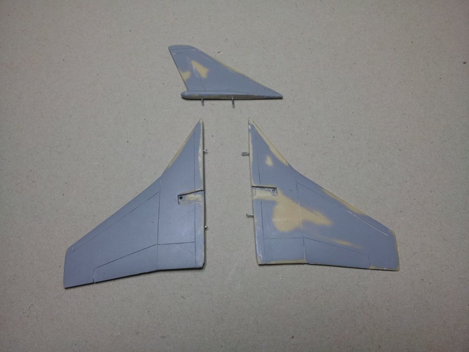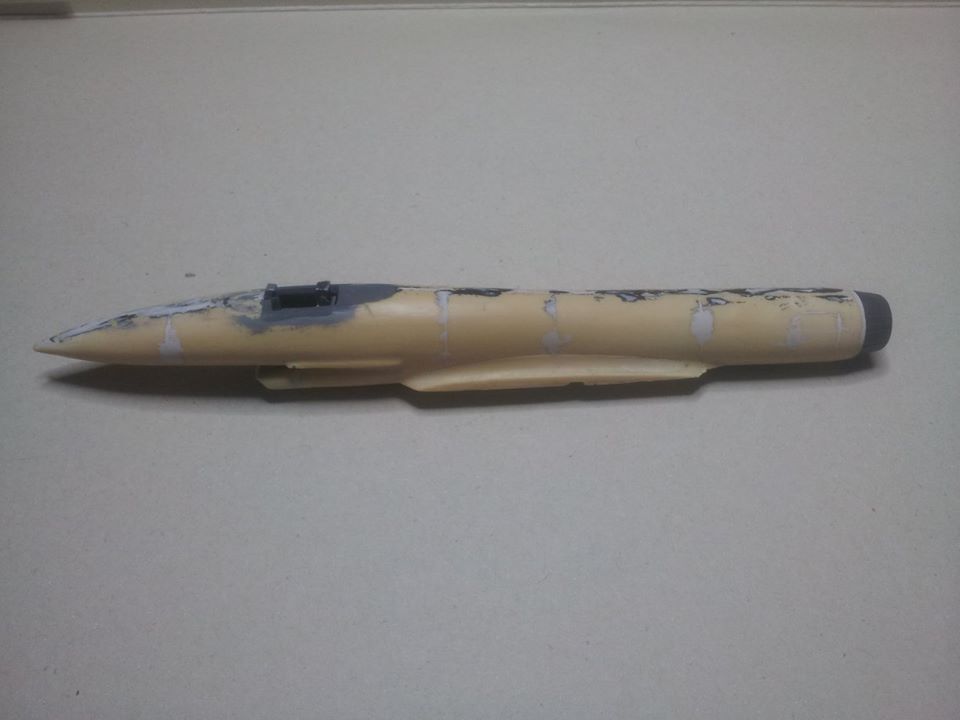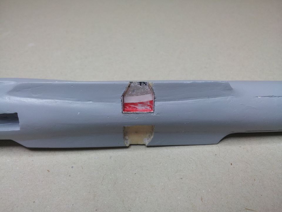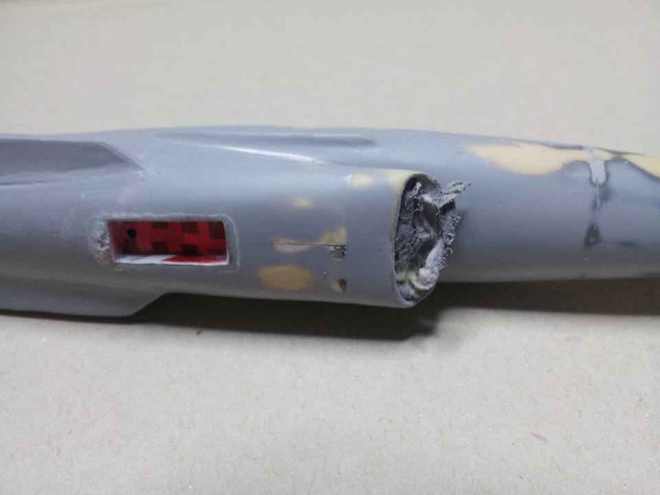 Na zadnjem delu trupa sem z pomočjo maskirnega traku ponazoril zračno zavoro, katero sem večkrat prebarval z temeljno barvo in na fino pobrusil, da sem dobil lepo gladko površino na njej in malce ublažil njen oster rob.