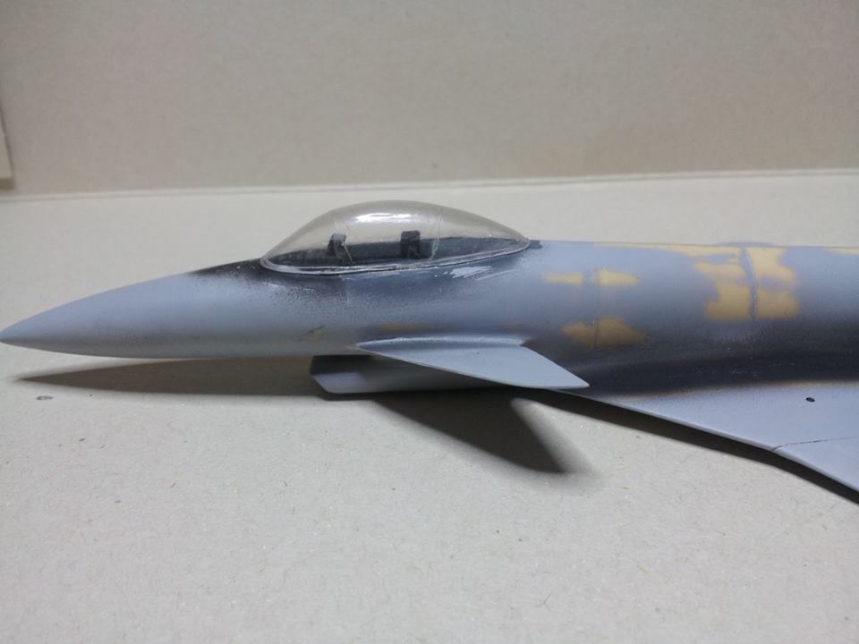 Ker maketa kokpita dobesedno nima sem ga bil primoran izdelati popolnoma od začetka v samogradnji. Uporabil sem nekaj rezervnih delov starejših maket malo pa sem tudi ustvarjal v samogradnji. Prej sem končal tudi izpušno šobo motorja, da sem lahko potem trup zalepil skupaj. Kot je vidno na sliki me je čakalo še zelo veliko dela, da sem sploh dobil lepo in gladko površino na maketi.