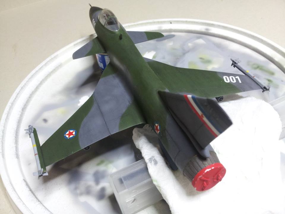 Ker sem se odločil narediti dioramo tega letala parkiranega na letališču, sem za vstopnik zraka v motor in izpušno šobo iz papirnate brissačke in pločevinke naredil zaščitna pokrova in ju primerno pobarval.