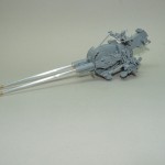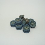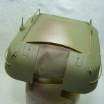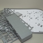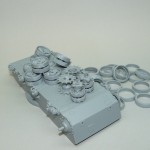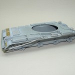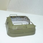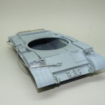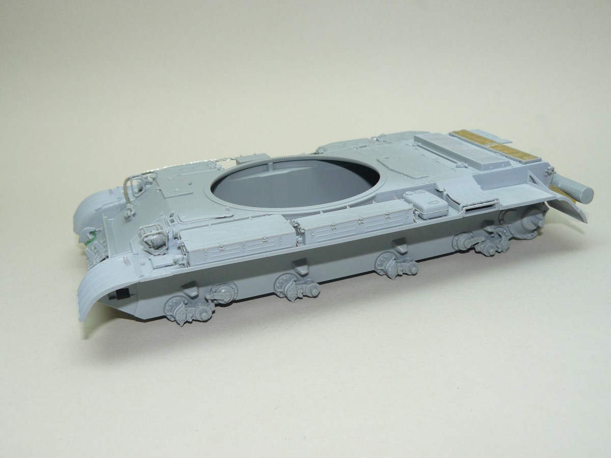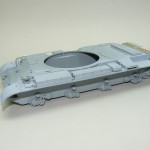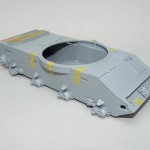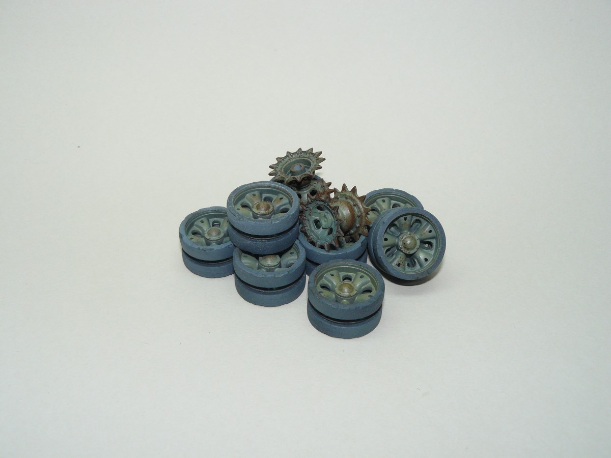 Kot je že pri oklepnikih v navadi, se sestavljanje začne s podvozjem. Najprej sem sestavil pogoski in vodilni kolesi, potem pa sem se lotil podpornih koles. Vsako je sestavljeno iz petih kosov. Začel sem s sestavljanjem platišč, nato pa na njih po brušenju in obrezovanju, nasadil še dela, ki predstavljata gumijasto oblogo na kolesu. Površino le teh sem prebrusil z bolj grobim smirkovim papirjem, robove pa sem z nožkom nekoliko poškodoval, kar je ponazorilo razpokano in odkrušeno gumo. Barval sem jih tako, da sem notranje strani koles senčil s črno barvo, bolj izbočene pa posvetlil z belo. Potem sem platišča prebarval z Revell aqua 361, katero sem uporabil tudi za končni nanos na celi maketi.