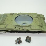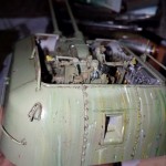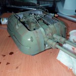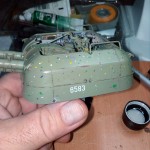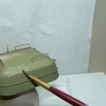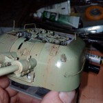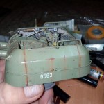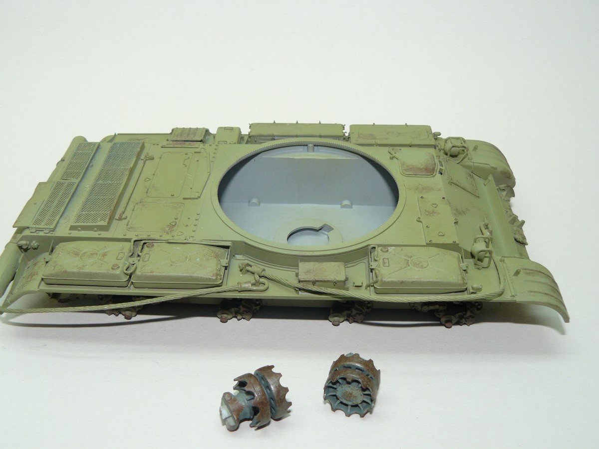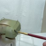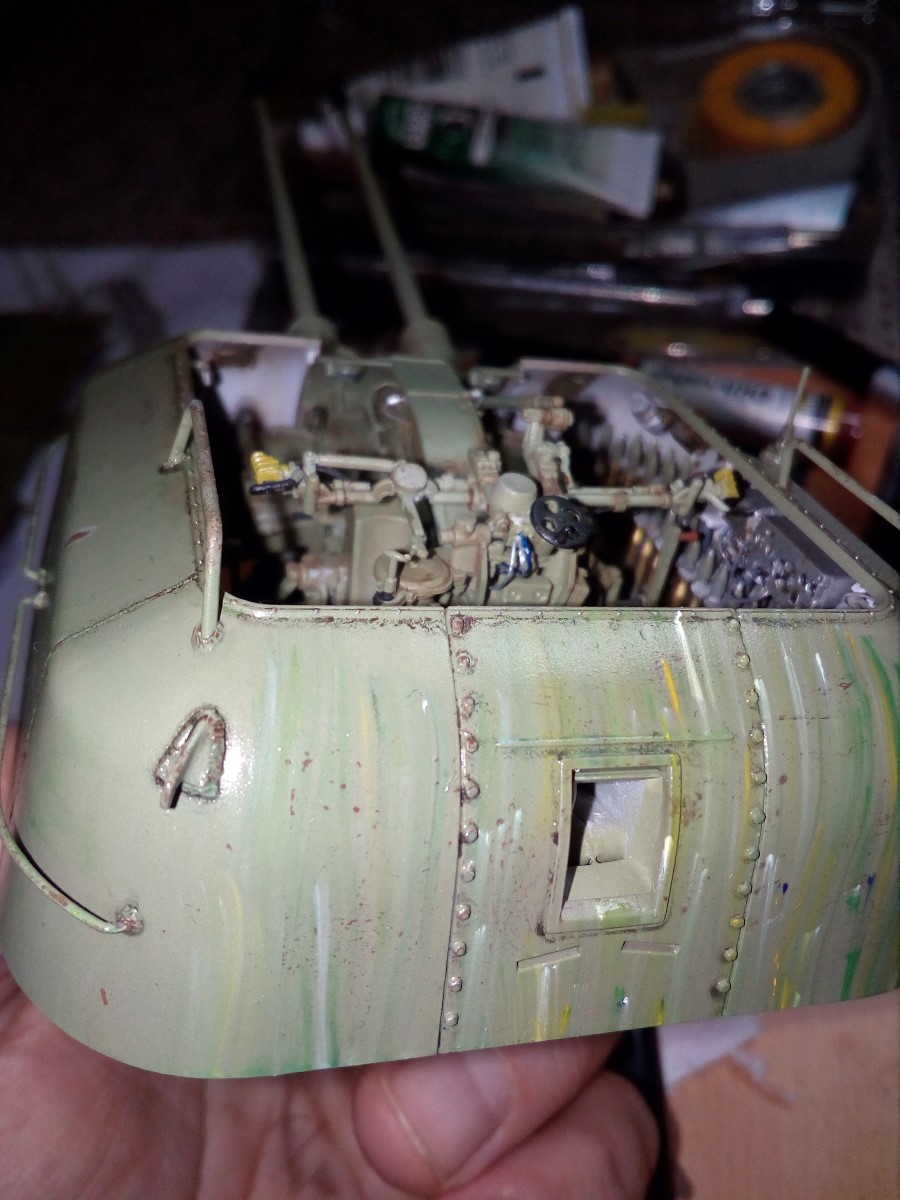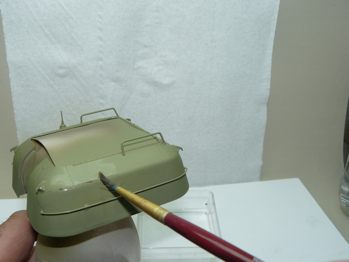 Po namestitvi nalepk sem z zobotrecem točkovno nanesel različne odtenke oljnih barv, katere sem prej iztisnil na lepenko, ko popije odvečno olje. Nato sem z mehkim ploščatim čopičem, namočenim v redčilo za oljne barve, s potezami od zgoraj navzdol, pomešal nanešeno barvo. S tem se je razbila monotonost, prikaže pa se tudi sledi stekanja vode in umazanije. Ko sem bil z rezultatom zadovoljen, sem z MIG Oilbrusherji ponazoril še stekanje rje, dodatne umazanije in nekoliko osvetlil zgornji del kupole