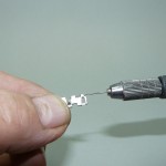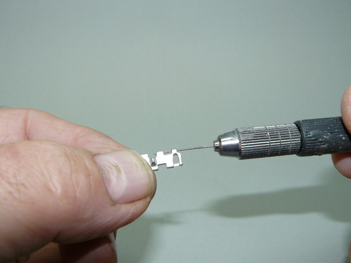 Členke pred sestavljanjem pregledamo, morebitne ostanke od vlivanja odstranimo z ostrim modelarskim nožkom, nato pa jih s svedrom o,5 mm povrtamo (sl.4). Na širši strani ne povrtamo skozi do konca, saj je na eni strani izdelana kapica sornika, ki povezuje členke.