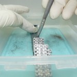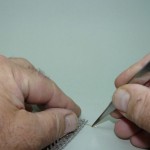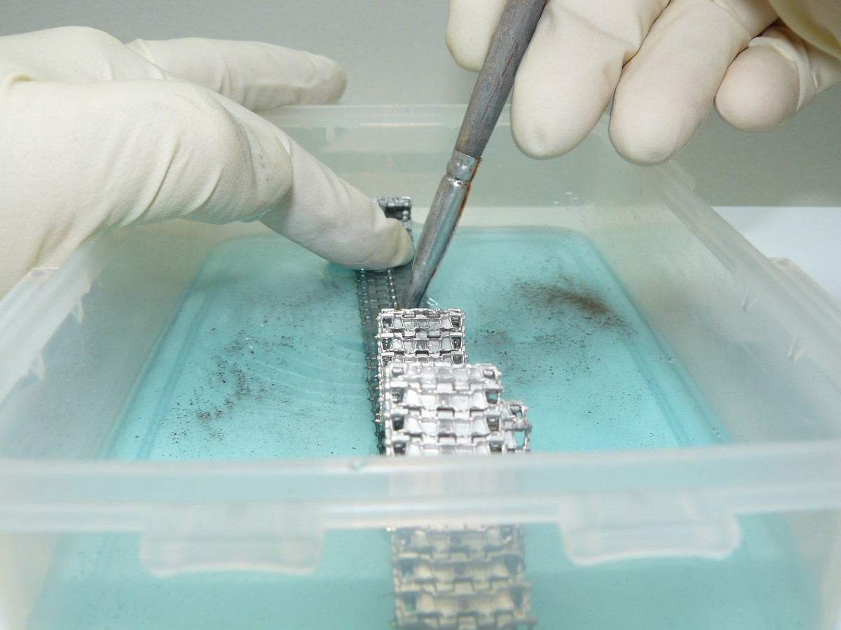 Ker je tekočina jedka, je potrebno zaščititi roke in delovno površino. V plastično ali stekleno posodo položimo sestavljene gosinice, jih zalijemo s tekočino, nato jih s trdim čopičem ali staro zobno krtačko zdrgnemo (sl.8), saj tako odstranimo ostanke maščobe, ki je morebiti ostala od vlivanja. Glede na to, kakšen rezultat želimo, prilagodimo čas namakanja. V tem primeru sem jih obdeloval minuto, nato pa jih spral v čisti vodi (sl.9).